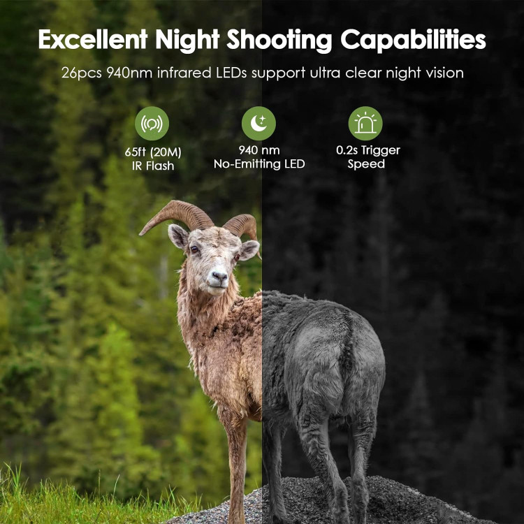 0.2s Trigger Time به معنای ثبت حیات وحش واضح برای شماست. با "حالت دید در شب"، دوربین بازی تصاویر واضح و واضحی را تا 65 فوت در شب می گیرد.