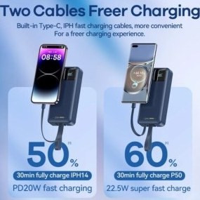 PD 20W, QC 22.5W, Fast Charging, LCD Display, High Capacity, High Quality Battery, Built in Cable