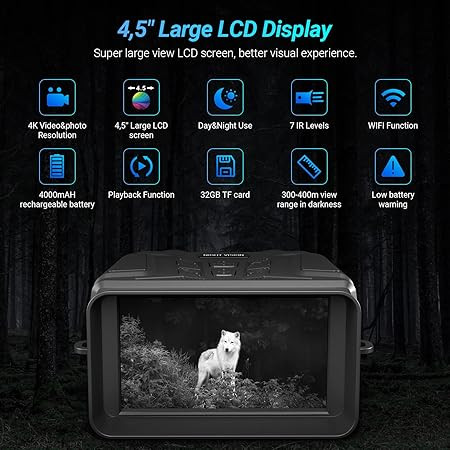 【صفحه نمایش فوق العاده بزرگ 4.5 اینچی】دستگاه های شکار دید در شب Cozion دارای صفحه نمایش بزرگ و عملکرد تصویر عالی هستند و تصاویر Ultra HD 7680*4320 و ویدئوهای صوتی 3840*2160 را ضبط می کنند که نهایت تجربه بصری را در اختیار شما قرار می دهد، همچنین می توانید این محتوا را ذخیره و دانلود کنید. به کارت حافظه و به اشتراک گذاری با دوستان خود. حداکثر پشتیبانی از کارت TF 644 گیگابایت.