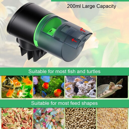 بر روی هر آکواریومی قابل نصب می باشد؛ علاوه بر غذای ماهی می توانید غذای آبزیان دیگر را نیز ریز یا درشت تر از نخود هم باشند درون آکورایوم با تایمر خاصی تعیین کنید تا دستگاه آن را درون آکورایوم بریزد.